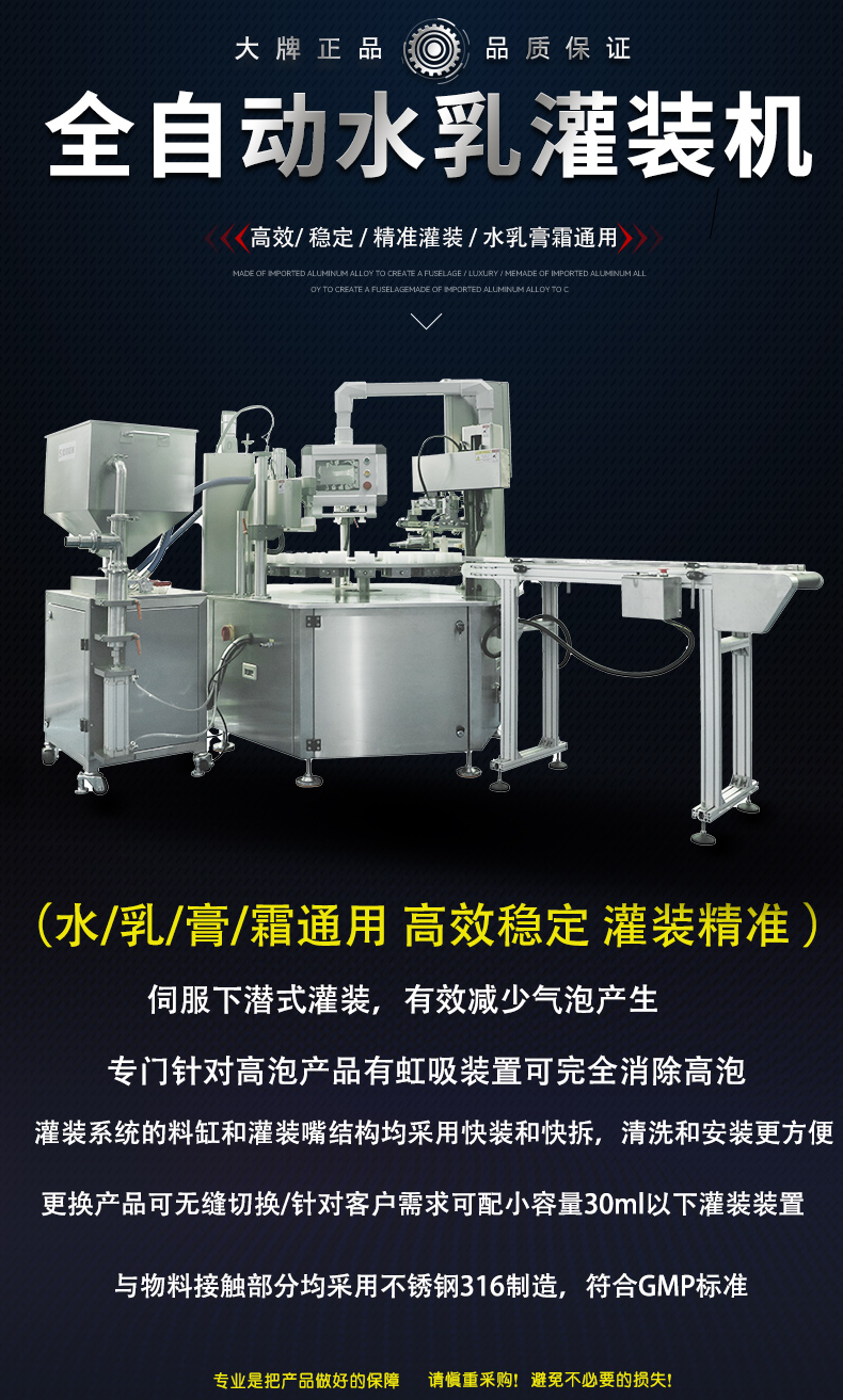 1、先要確定自己要灌裝的產品。有的廠家產品品種多,在購買灌裝封尾機時,希望一臺灌裝設備搞定所有。實際上專用機比兼容機的灌裝效果要好,灌裝范圍不同,型號不同,用料結構差別,價格也不一樣,如果灌裝范圍差距比較大的產品盡可能分開機器灌裝。