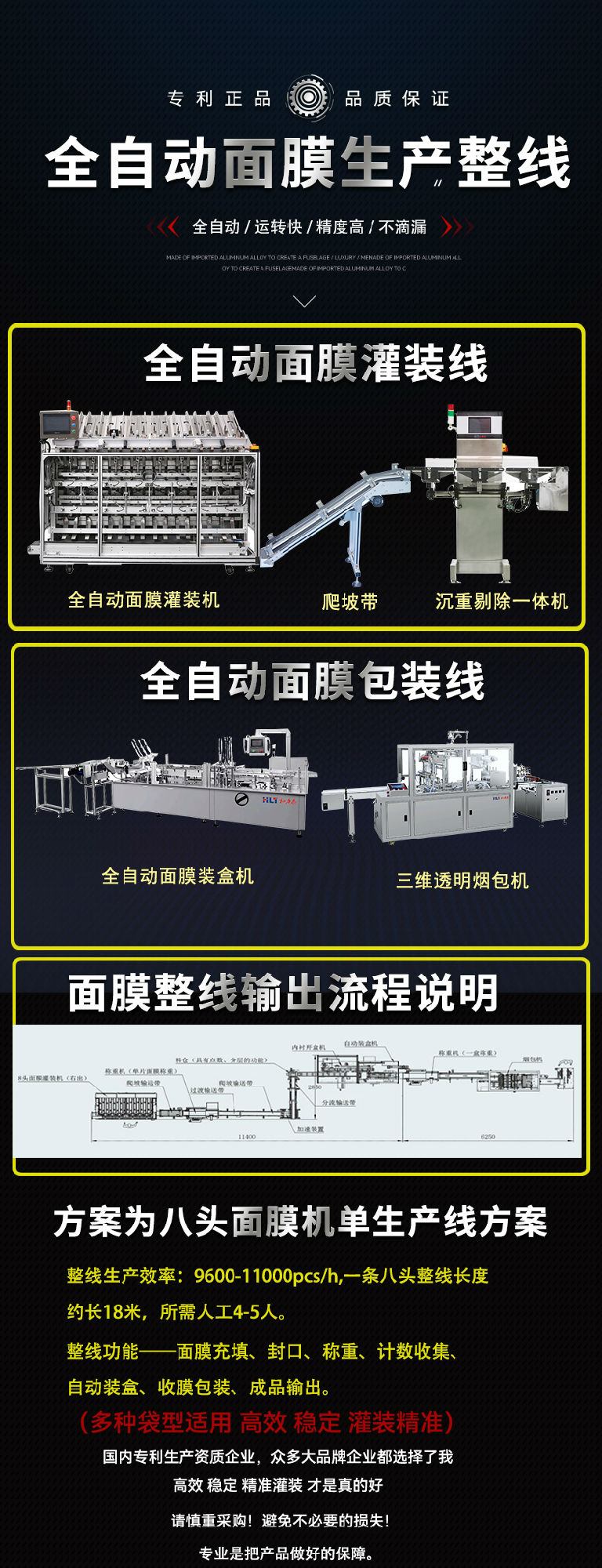 同時面膜灌裝除了以往的單線面膜灌裝,我們又著手研發和試驗成功了六頭面膜灌裝生產整線,八頭面膜灌裝生產整線,十頭面膜灌裝生產整線,整線又分為,單線,二線合一、三線合一和智能機械手、AGV全自動全方位全自動智能化。