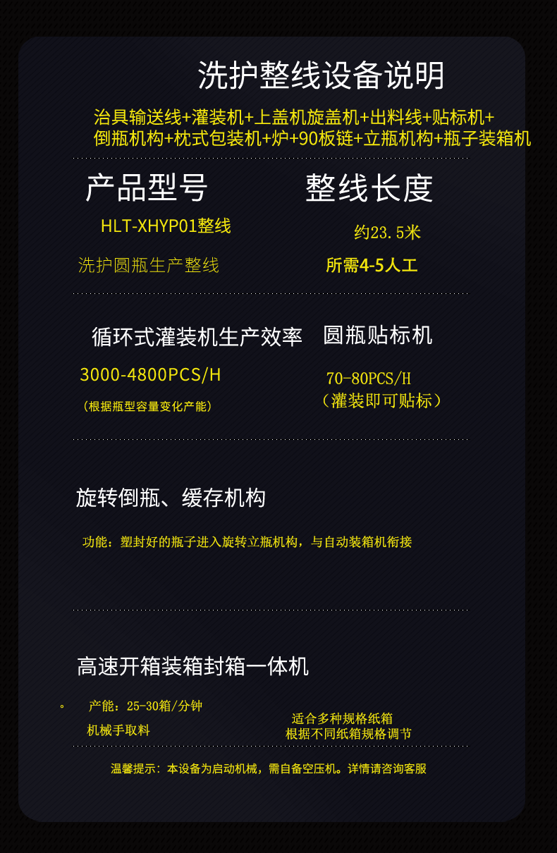 整線組成設備:治具輸送線+灌裝機+上蓋機旋蓋機+出料線+貼標機+倒瓶機構+枕式包裝機+爐+90板鏈+立瓶機構+瓶子 裝箱機