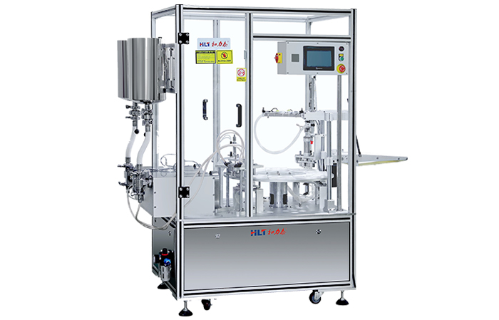 工作流程:手動(dòng)放瓶—自動(dòng)灌料-手動(dòng)放內(nèi)圈-自動(dòng)壓內(nèi)圈—抓手取瓶放至生產(chǎn)線。